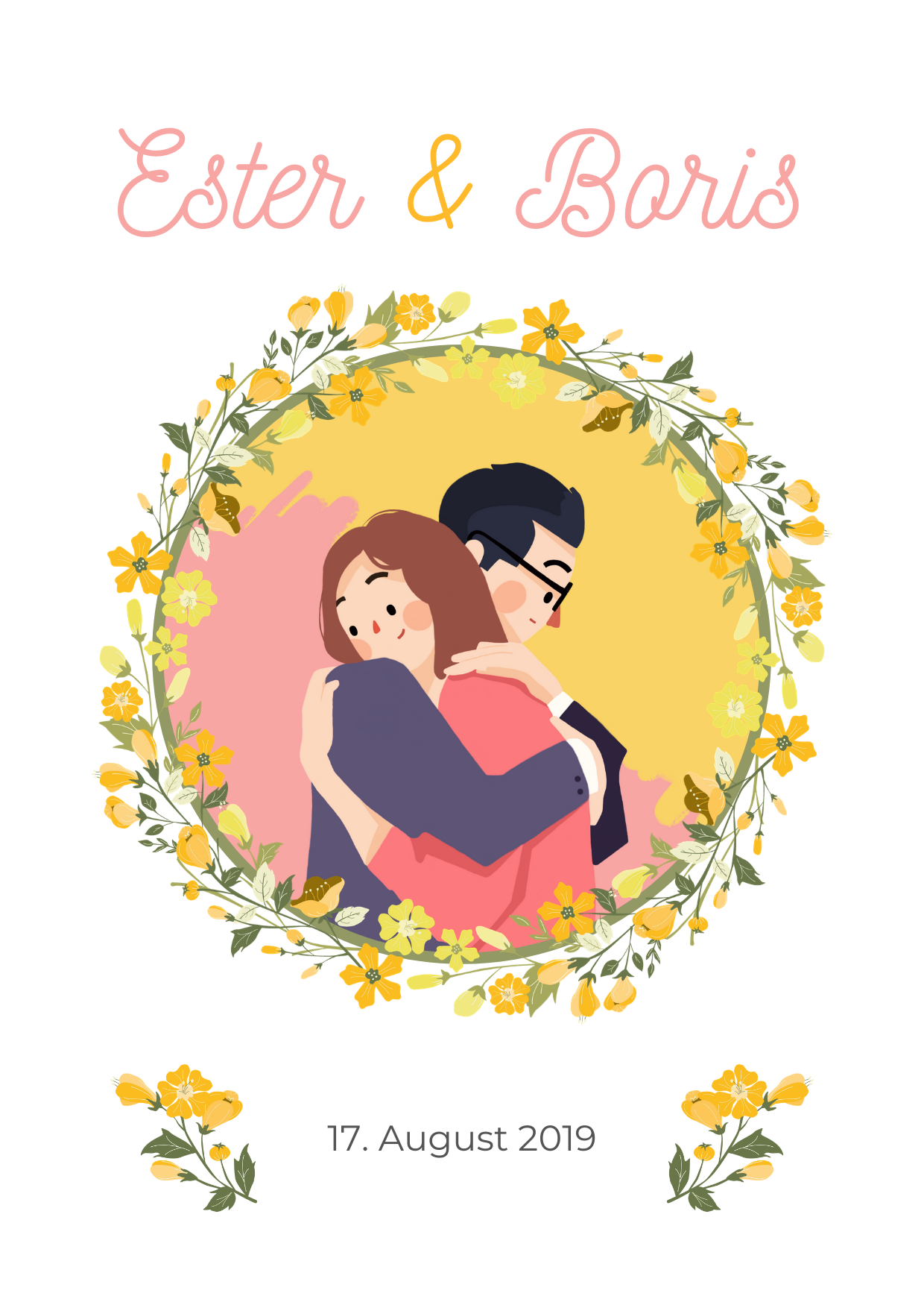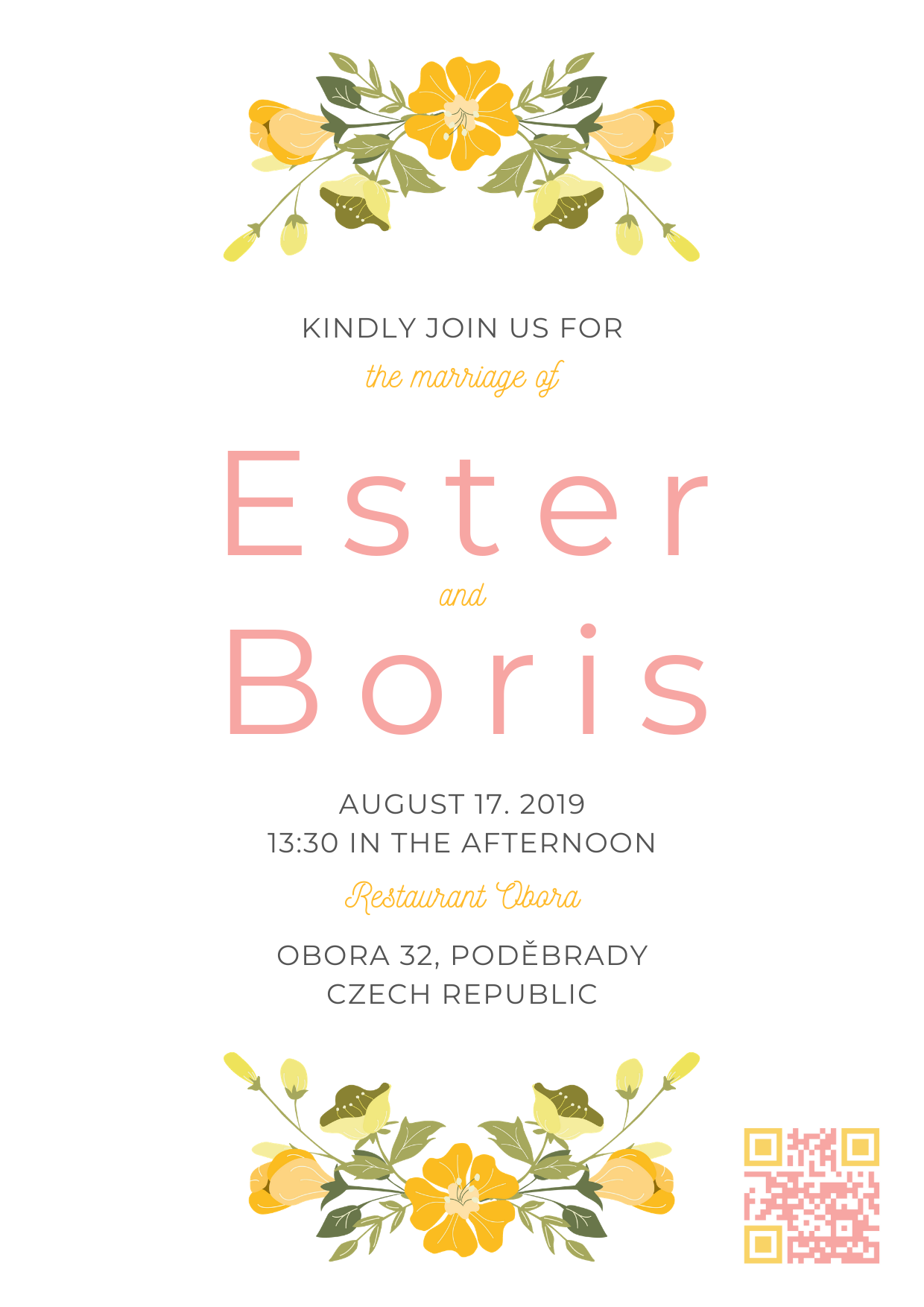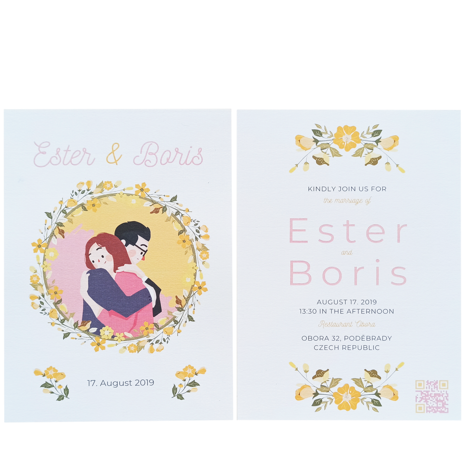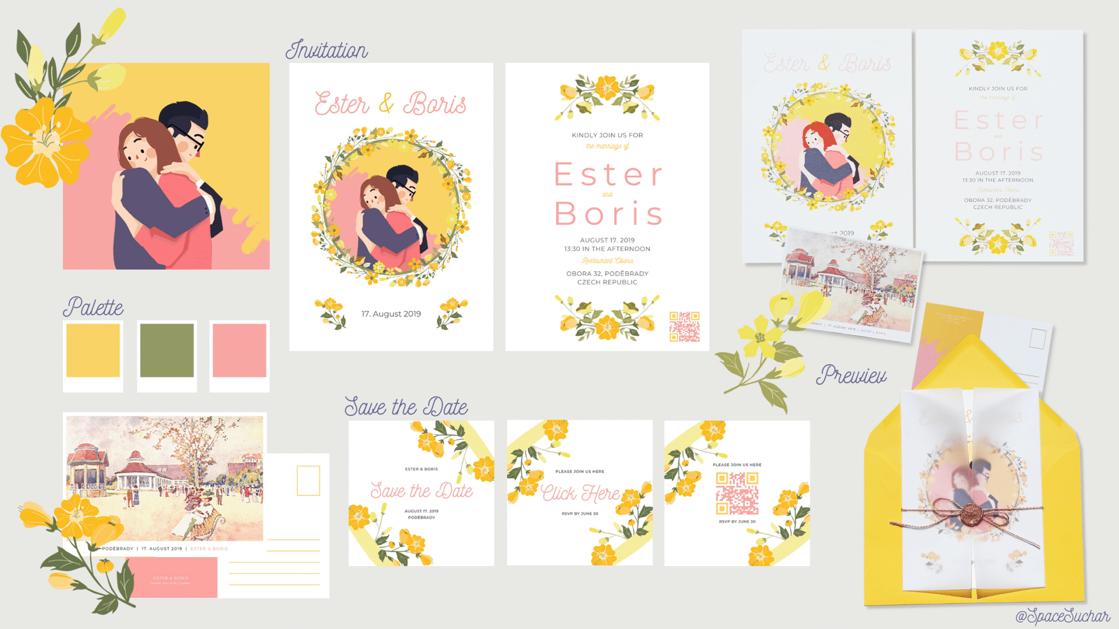 This is a wedding design I did for my own wedding. It consists of a wedding invitation, RSVP card, Save the date card with a QR code that leads to the wedding website, hand-drawn picture of the bride and groom and postcard of the city that the wedding took place in as a memento.